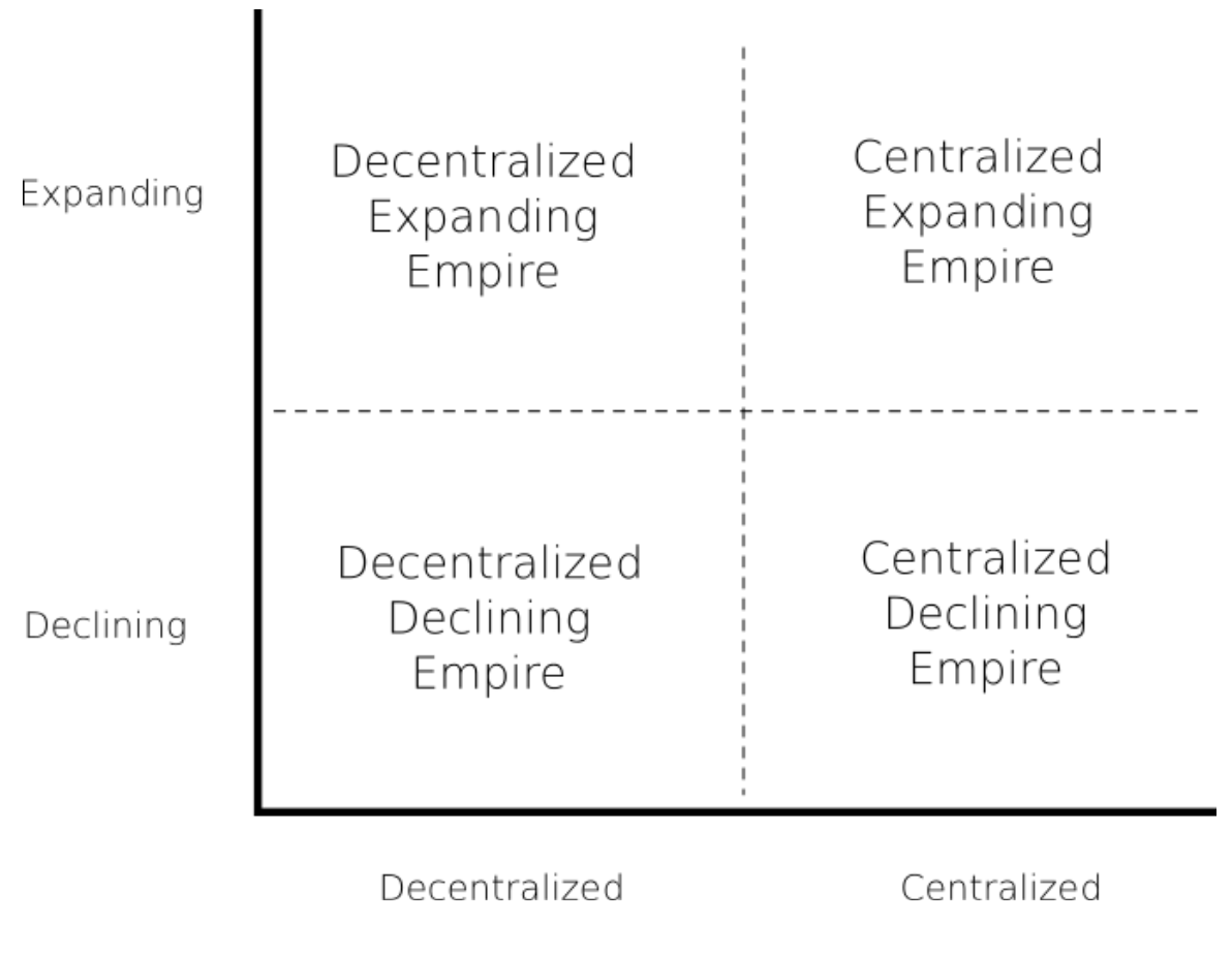 For any empire, we can ask how centralized it is: to what degree is high coordinating, and coordinated with, the rest of the empire, specifically mid? Though the level of centralization is a continuum, we can draw a line somewhere in the middle and say that an empire on one side is centralized, and an empire on the other is decentralized. We can also ask whether the empire is expanding—that is, gaining resources from outside—or declining. Combining the answer to both questions yields four empire types. Typing empires in this way allows us to rapidly understand the basic internal dynamics of a given empire.